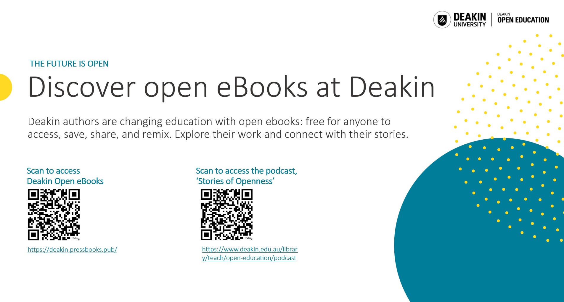 - Explore the catalogue via Deakin Open eBooks, Deakin’s own instance of Pressbooks to host our growing catalogue of Deakin-published OER