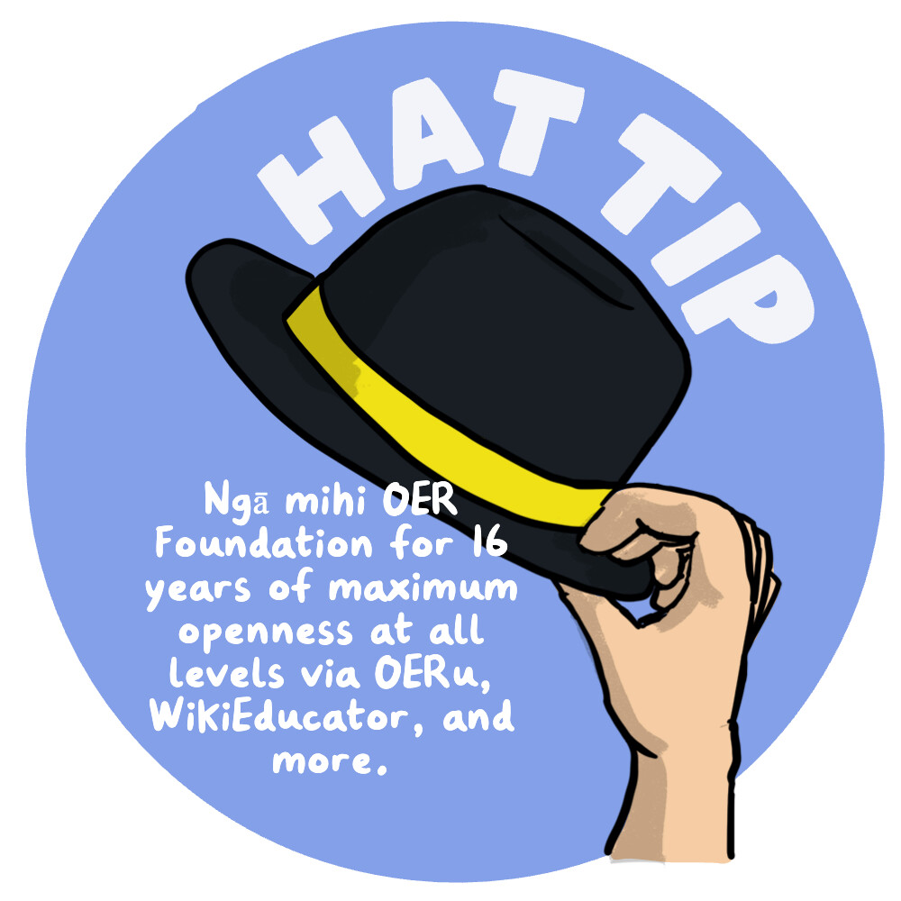 To me this is an appropriate time for the concept of small acts of open recognition I have tried to instigate as “Hat Tips” via the Open Thinkery Remixer Machine. Here is a small gesture of appreciation to @Mackiwg @lightweight and the many participants over 16 years who have benefitted or been inspired by the OERu and WikiEducator