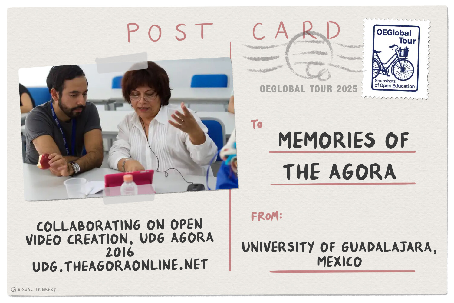 Just to share an example of using the digital postcard remixers to show what open education looks like, I reached back to memories of 2015 and 2016 when I was part of the UDG Agora project at the University of Guadalajara.