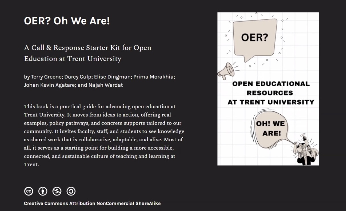 This book is a practical guide for advancing open education at Trent University. It moves from ideas to action, offering real examples, policy pathways, and concrete supports tailored to our community. It invites faculty, staff, and students to see knowledge as shared work that is collaborative, adaptable, and alive. Most of all, it serves as a starting point for building a more accessible, connected, and sustainable culture of teaching and learning at Trent.