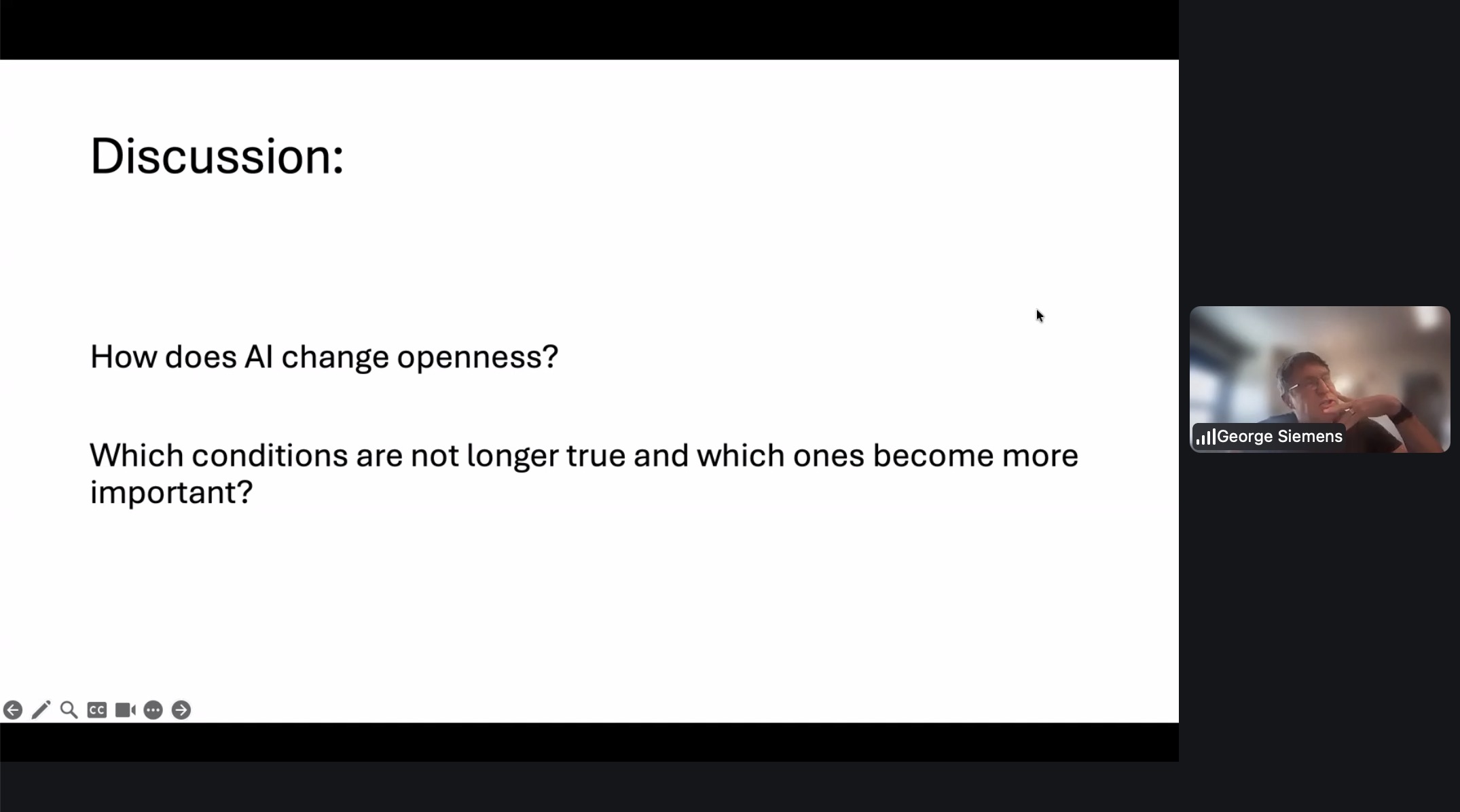 George of course has been very front and center with artificial intelligence, and I appreciate his conversational approach today solicit discussion on the challenging intersection of Open Education and AI.